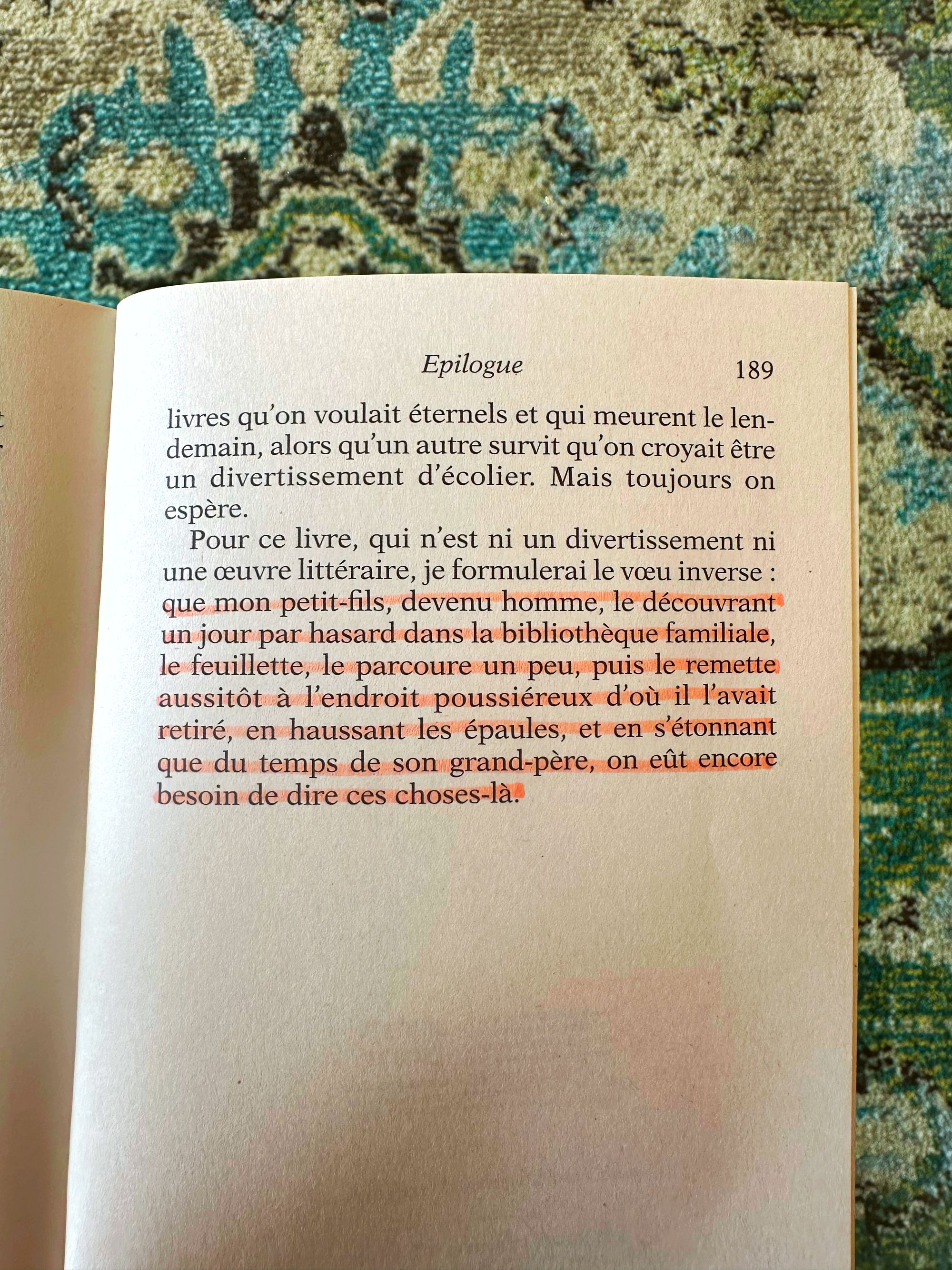 Que mon petit-fils, devenu homme, le découvrant un jour par hasard dans la bibliothèque familiale, le feuillette, le parcours un peu, puis le remette aussitôt à l’endroit poussiéreux d’où il l’avait retiré, en haussant les épaules, et en s’étonnant que du temps de son grand-père, on eût encore besoin de dire ces choses-là.