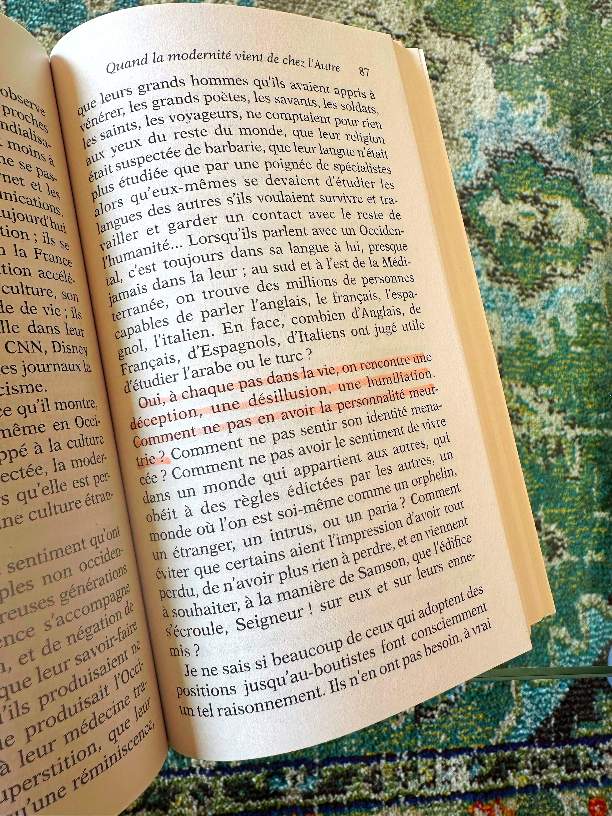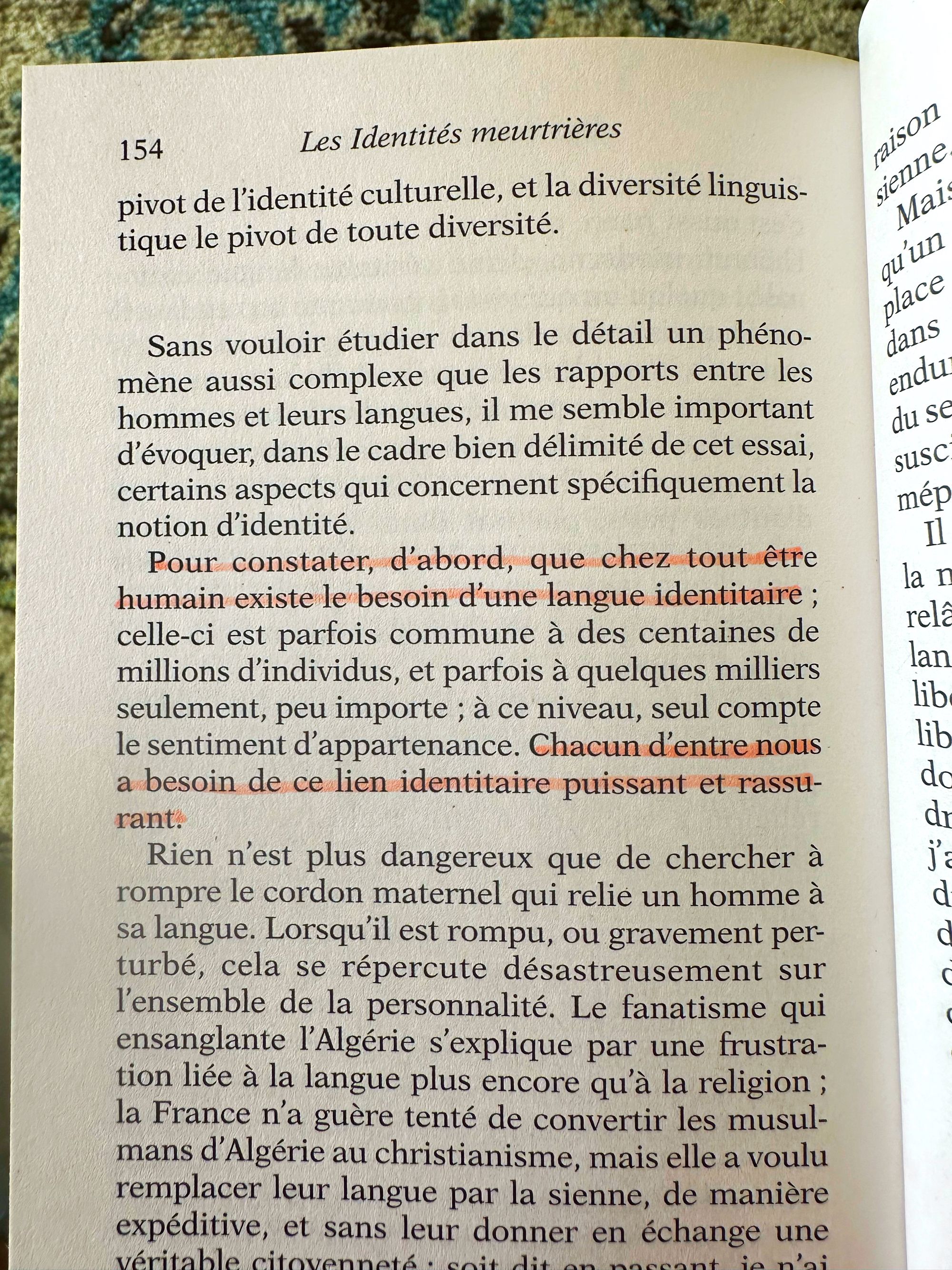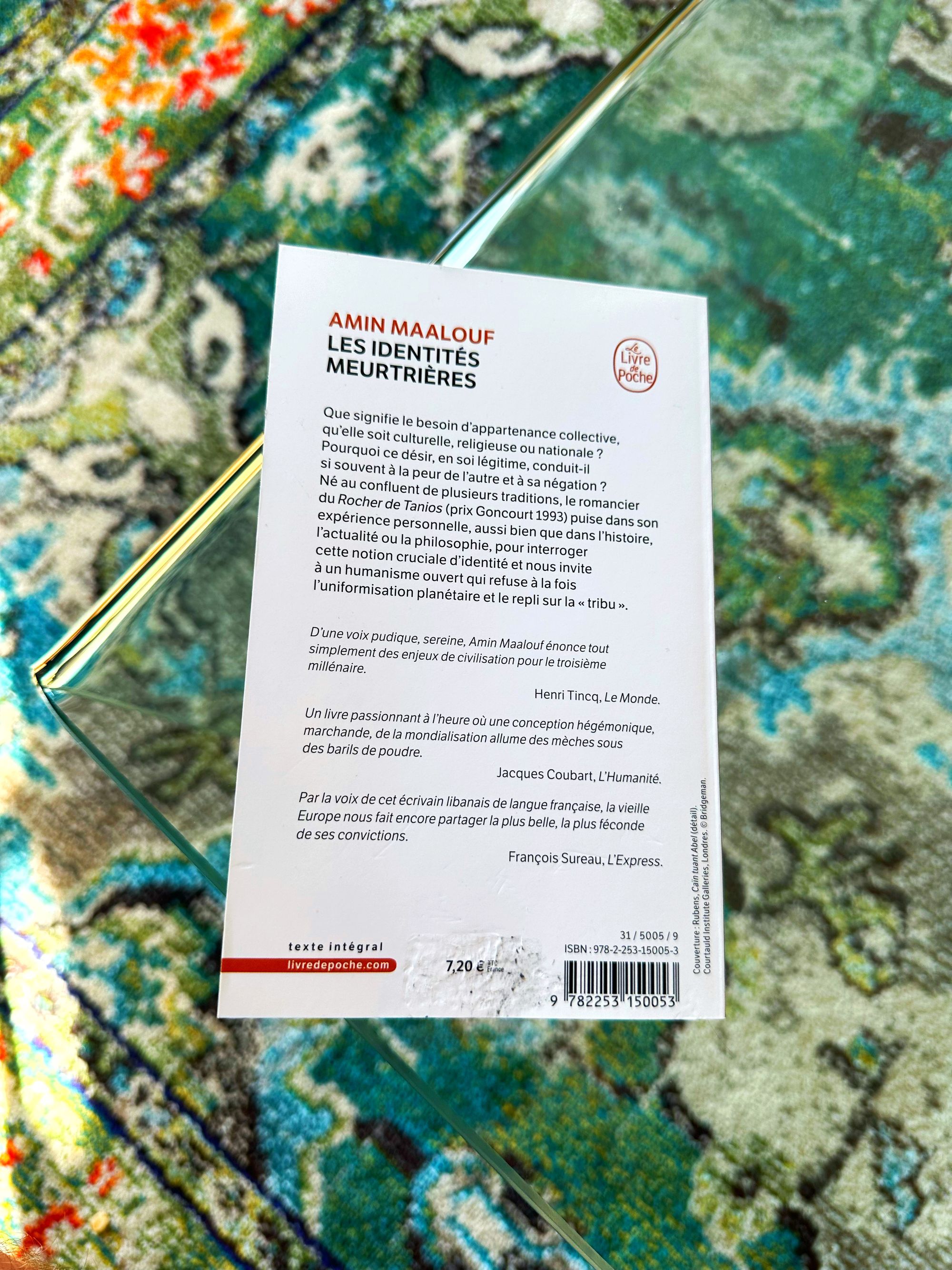 Et quelle lecture. Amin Maalouf, avec son intelligence et son style habituels, développe la question de l’identité. Qu’est-ce que ce besoin d’appartenance, soit-il religieux, culturel ou national ? Comment se fait-il que sa seule proclamation le mette en opposition avec les autres ? La différence oppose plus qu’elle ne rassemble, on ne célèbre pas la pluralité et on punit la divergence.